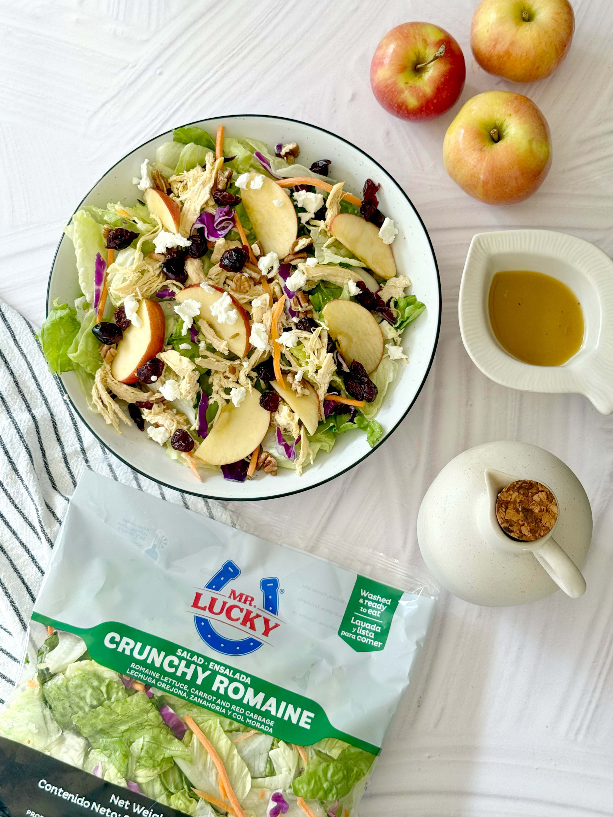 En un bowl mezcla la Ensalada Crunchy Romaine que ya se encuentra lavada y lista para servir, agrega el pollo deshebrado, rebanadas de manzana, arándanos, queso y el aderezo honey mustard.