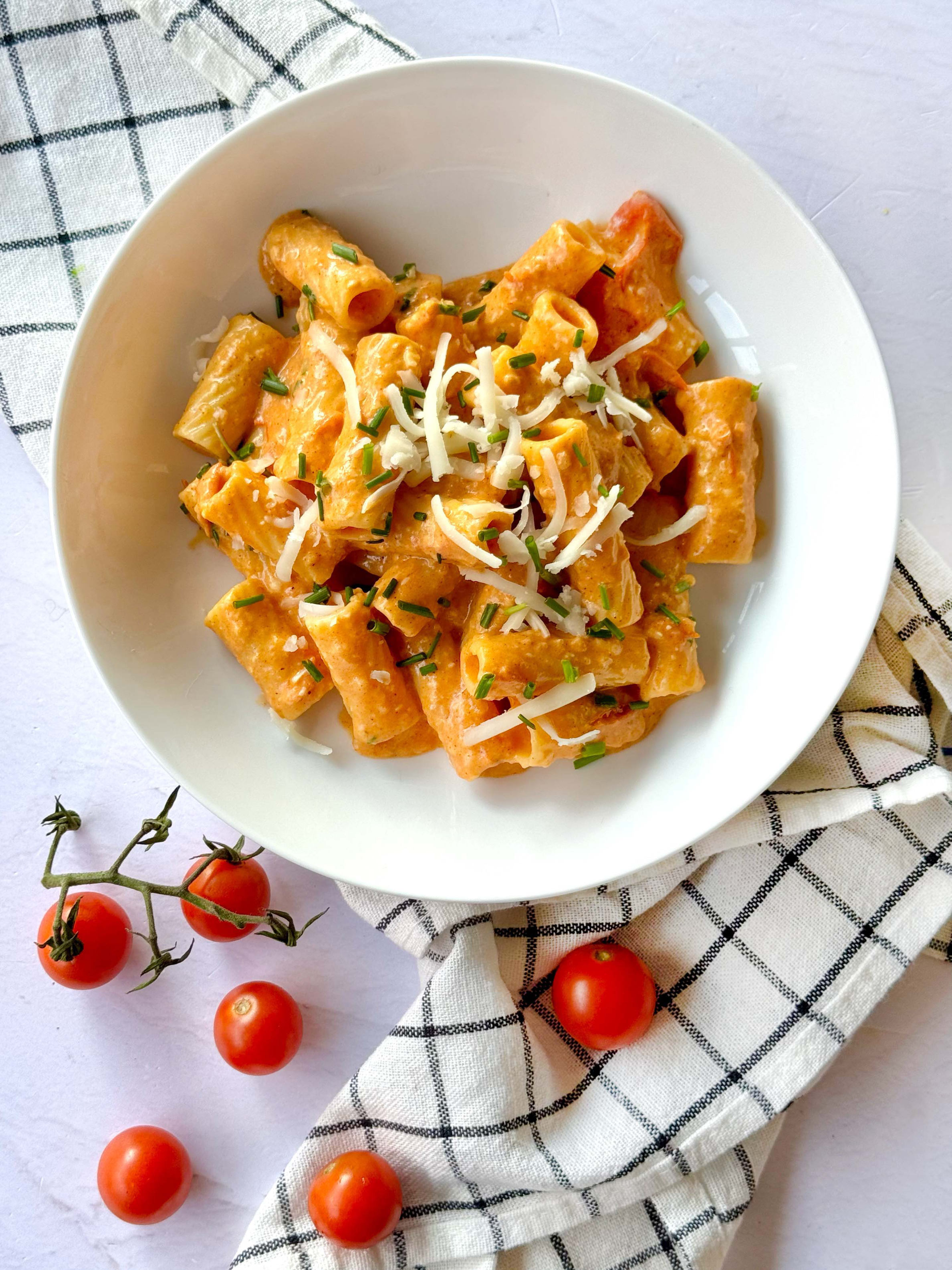 En un bowl coloca los tomates cherry del racimo y enjuágalos. En un sartén caliente agrega aceite de oliva, cebolla y ajo, cuando esté dorado agrega los tomates cherry, una vez que estén suaves los licúas. A la mezcla agrega pimienta, paprika, sal y crema o yogurt griego. Añade el queso hasta que se derrita y mezcla todo bien e incorpora la pasta al dente. Mezcla y sirve.
